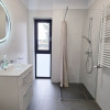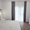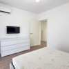 Dormitorul, de asemenea minimalist, dotat cu un pat King Size marginit de noptiere si lampi ambientale si o comoda TV se regaseste langa baia cu cabina walk-in si fereastra mare catre exterior.