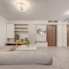 Locuința este compusă dintr-o cameră de zi spațioasă, cu ieșire spre balcon, bucătărie închisă cu perete de sticlă, dormitor de 17,50mp, dressing și baie cu cadă. Este complet mobilată și utilată.