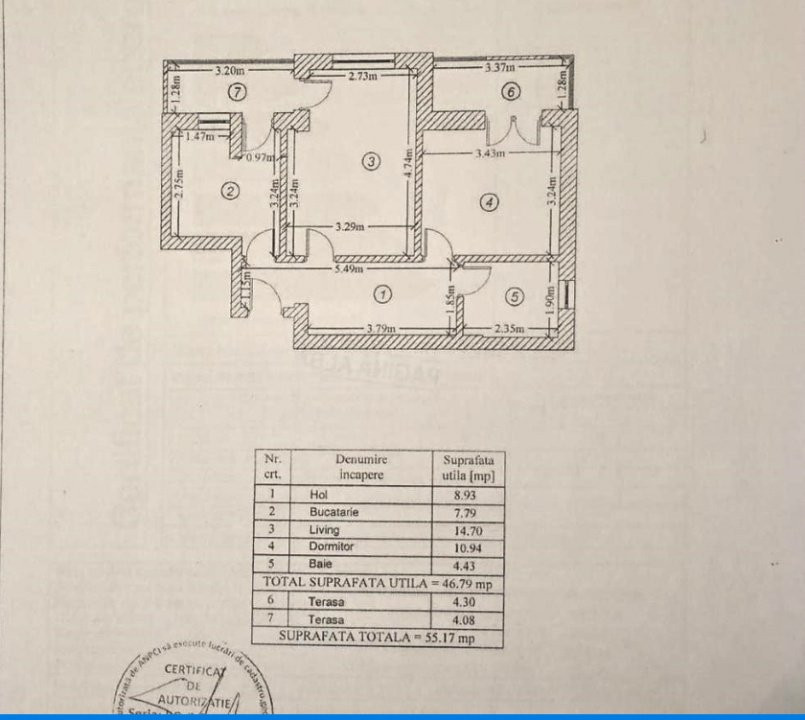 Locuința are o suprafață utilă de 47 mp la care se aduga cele doua balcoane in suprafata de 8.38 mp ,in total 55,17 mp .