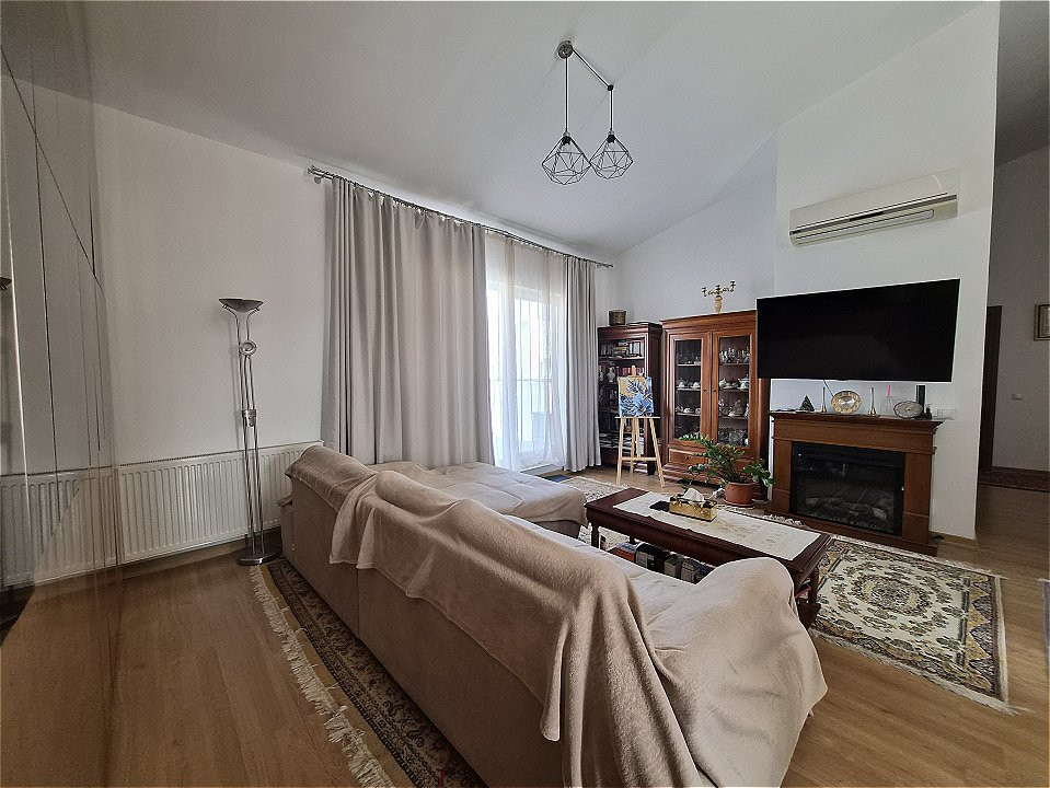 * Living spațios și luminos, cu aer condiționat, șemineu electric ce poate incalzi spatiu și un perete întreg dedicat depozitării, prevăzut cu dressing generos;