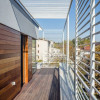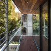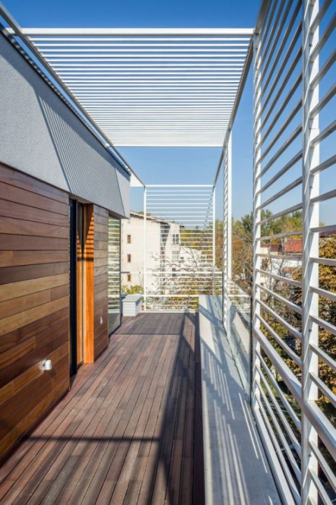 Lemnul este folosit ca material „viu” cu sensibilitate deosebită, proprietăți tactile, capabil să „atrage” și să inducă o anumită stare. Locația sa este aleasă pentru a permite apropierea, atingerea directă. Prin urmare, fațada din zona teraselor are elemente verticale realizate integral din lemn tratat cu ulei. Contribuie la compoziția generală a casei, dar este accesibilă direct și de aproape. Plafoanele din lemn sunt foarte vizibile din stradă și foarte plăcute de pe terase, încadrate de margini din plăci de metal negre. . Plăcile din lemn și metal sunt montate cu atenție, cu caneluri pe pereți, tavane și punți, permițând ventilația și schimbările de dimensiune datorită variațiilor de umiditate și temperatură. "