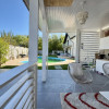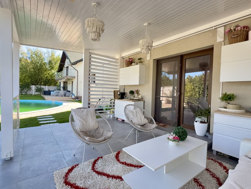Exteriorul completează perfect confortul interior. O terasă generoasă devine locul ideal pentru mic-dejunuri târzii sau seri liniștite în aer liber, în timp ce piscina privată adaugă un plus de exclusivitate și rafinament, transformând curtea într-un veritabil spațiu de relaxare personal.