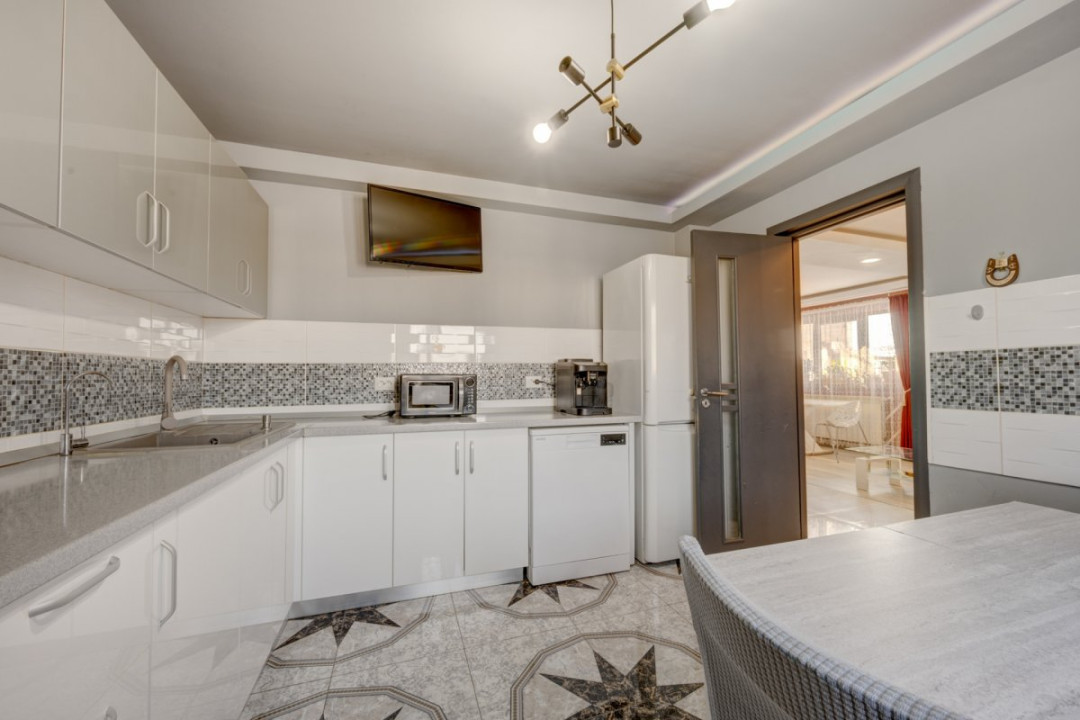 Interior luminos, bucatarie inchisa, living mare, spatii de depozitare, constructie proprie.