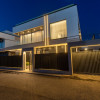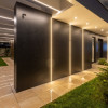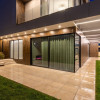 Placata cu fibrociment si HPL fixat prin lipire pe structura de aluminiu. Fara prinderi vizibile. Iluminat LED integrat in fatada;