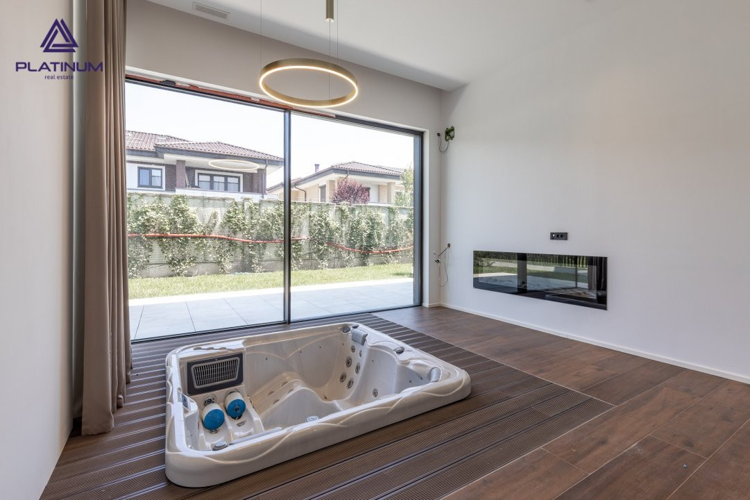 • Camera SPA dotata cu Jacuzzi, sauna si semineu, cu posibilitatea deschiderii automate a tamplariei "hi finity Reynaers, pentru acces in gradina;