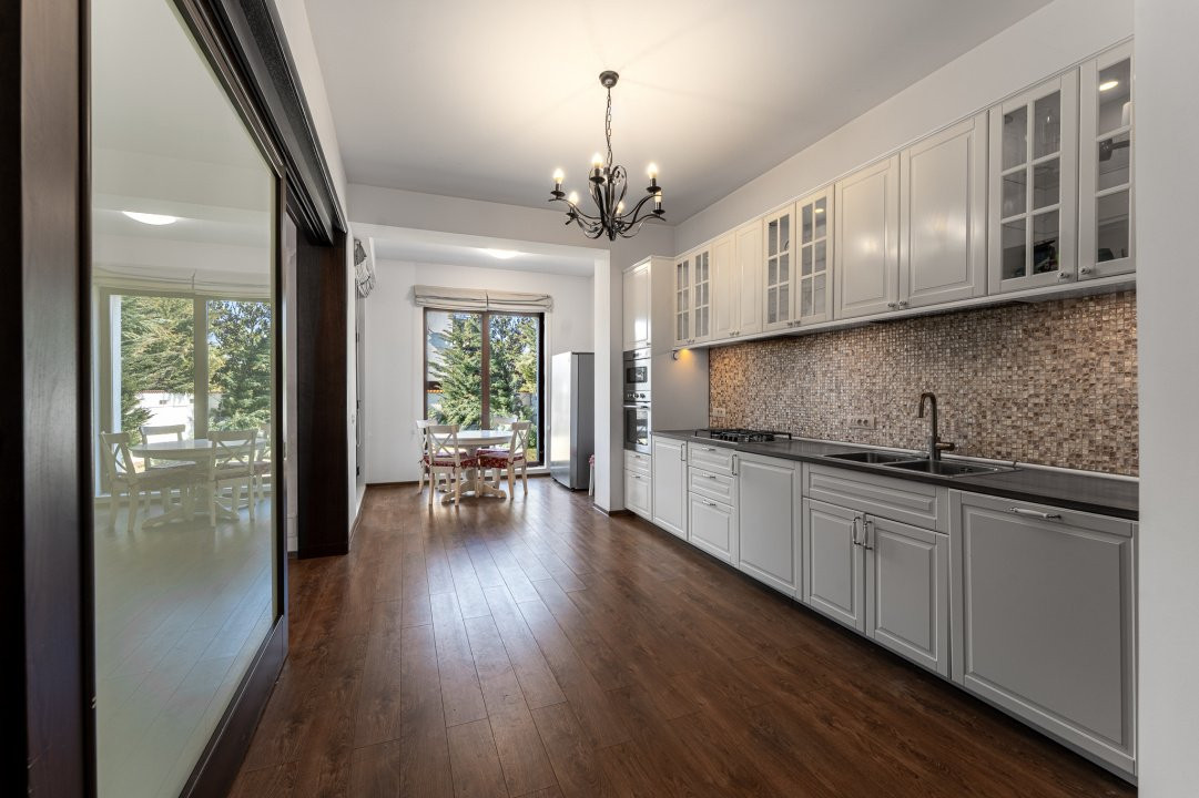 Vila dispune de 8 camere, dintre care 5 dormitoare spațioase și un birou, 7 băi, o terasă generoasă, 4 logii, multiple spații de depozitare, spălătorie și garaj dublu.